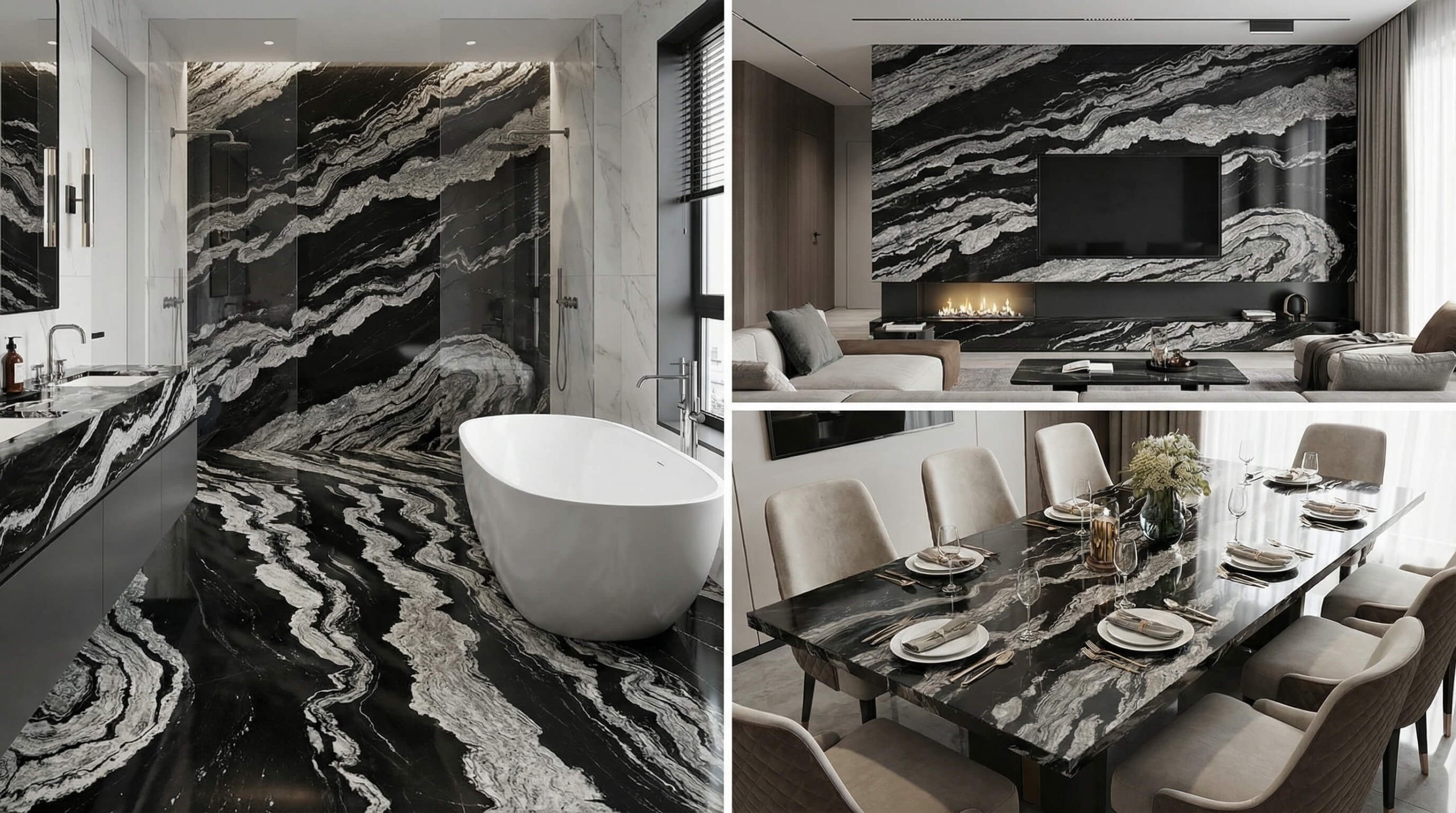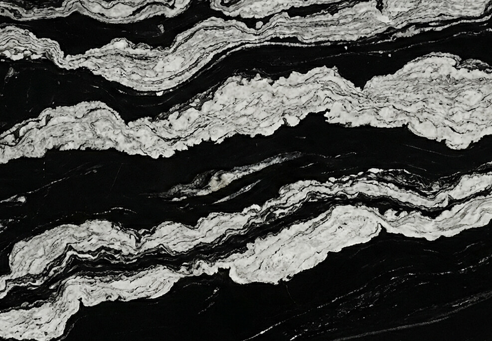 A dramatic and durable natural stone featuring a black canvas swept with bold, wave-like swirls of white and cream. Its dynamic pattern resembles a flowing river, offering a unique, artistic focal point ideal for kitchen countertops and statement islands.