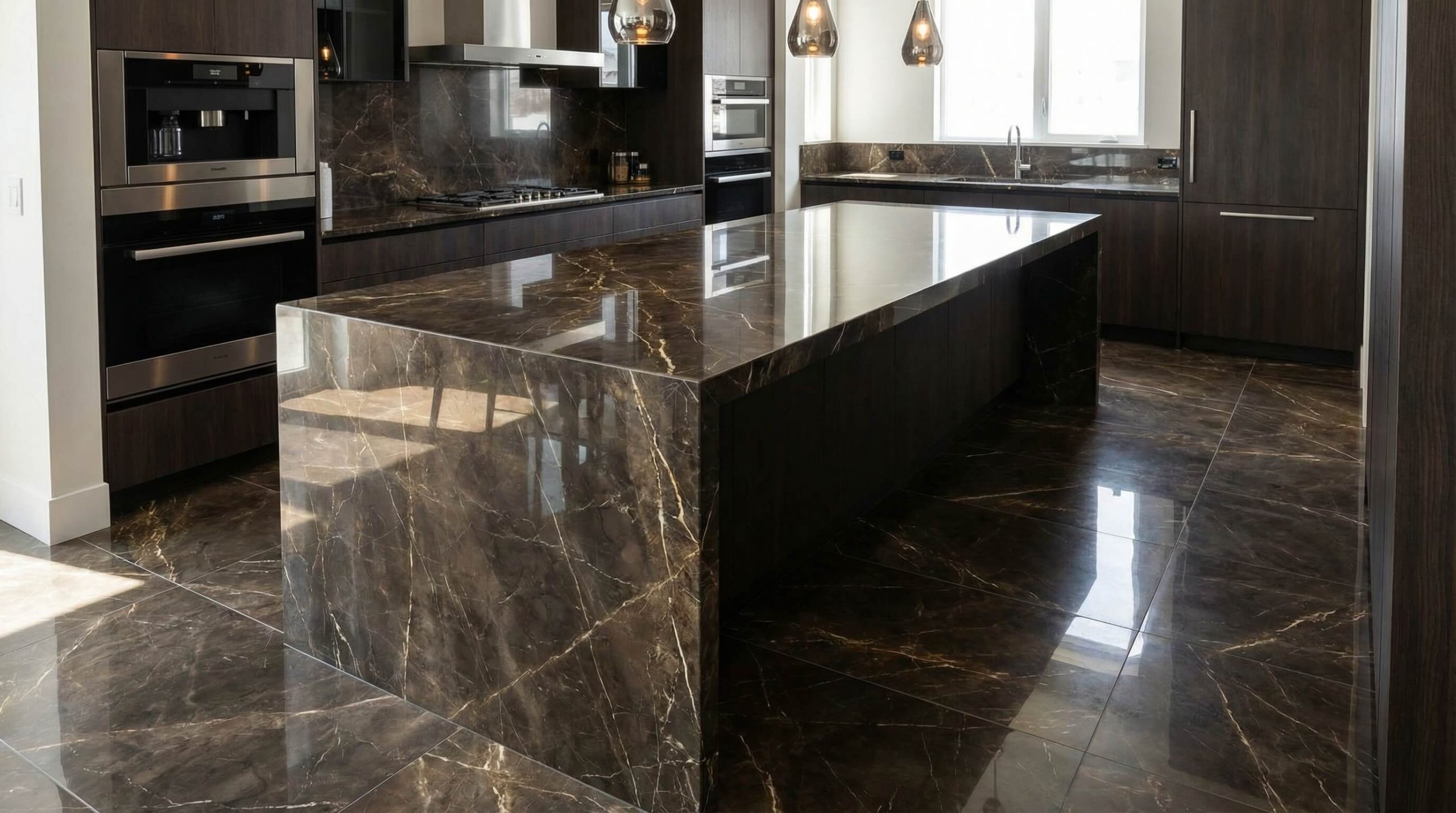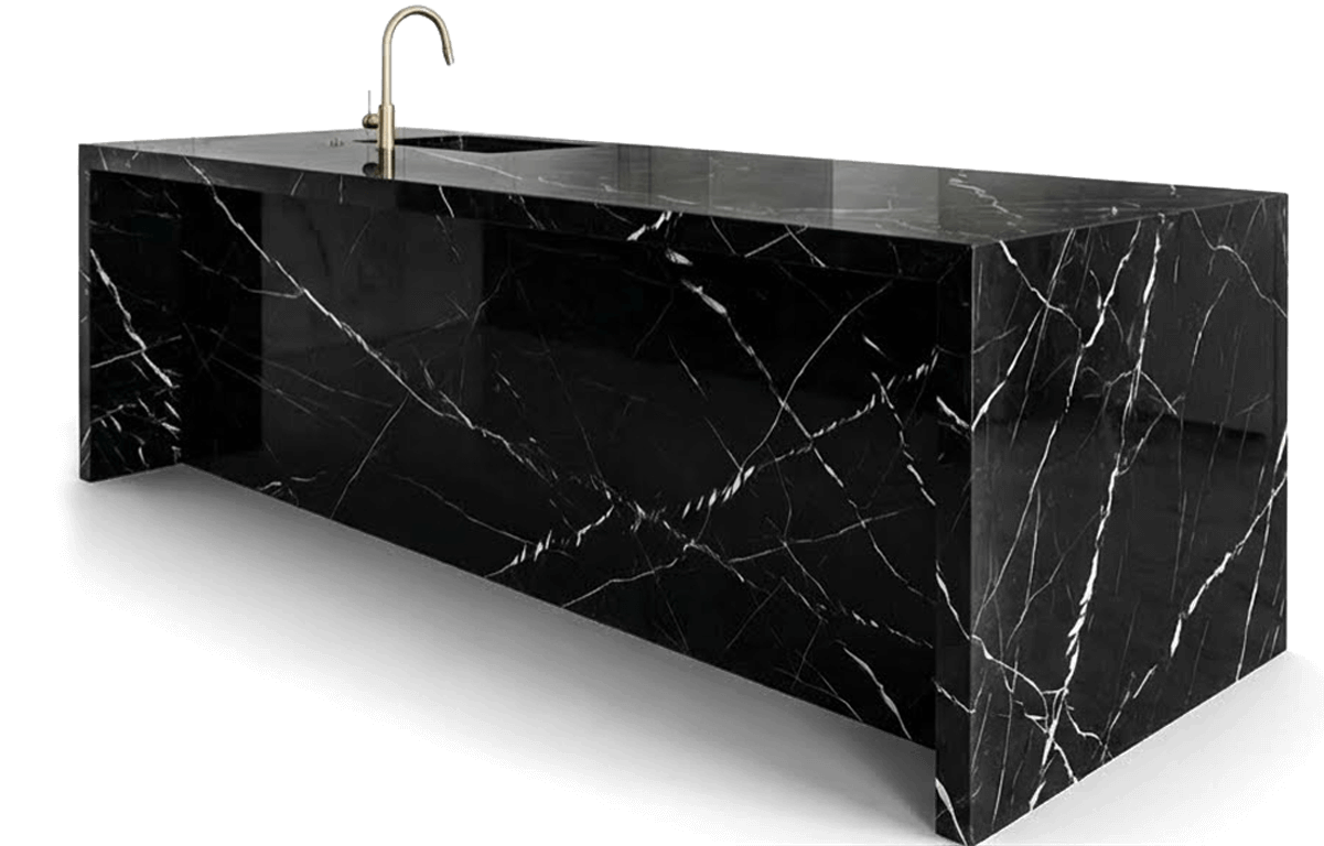 Redefine your culinary space with a custom Nero Marquina island. The seamless waterfall edges allow the dramatic white veining to flow uninterrupted from surface to floor, creating a stunning focal point for your kitchen.