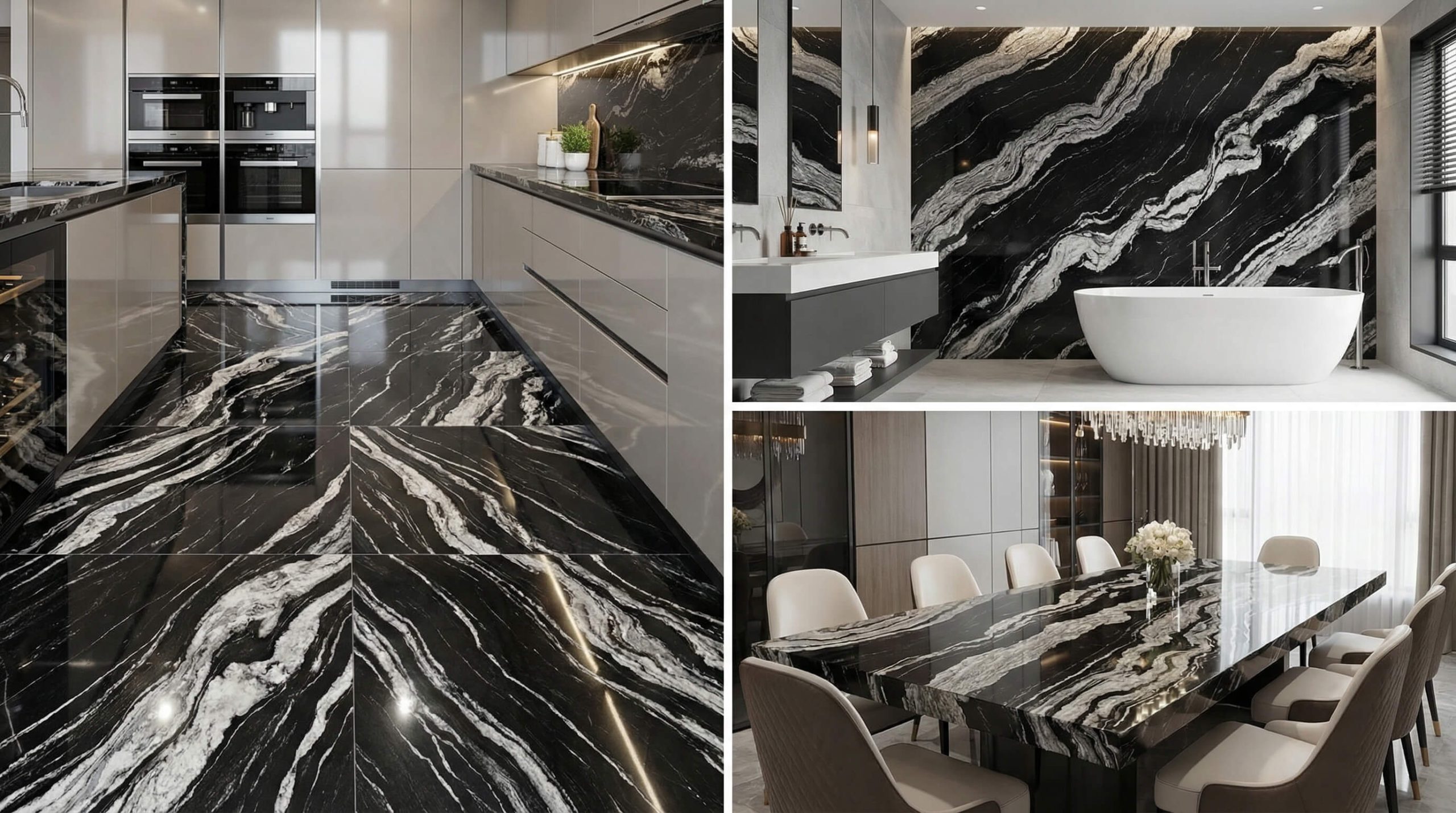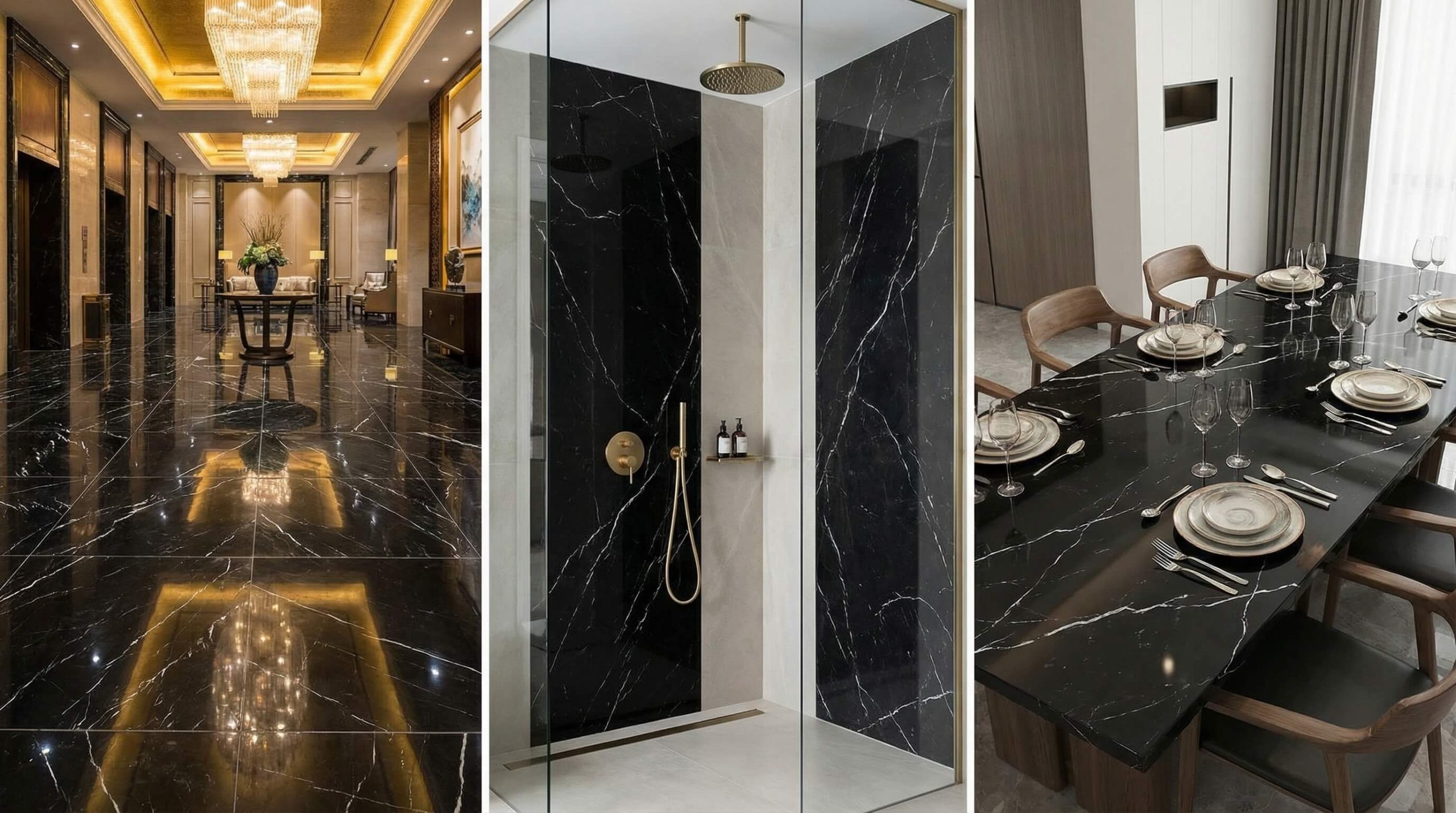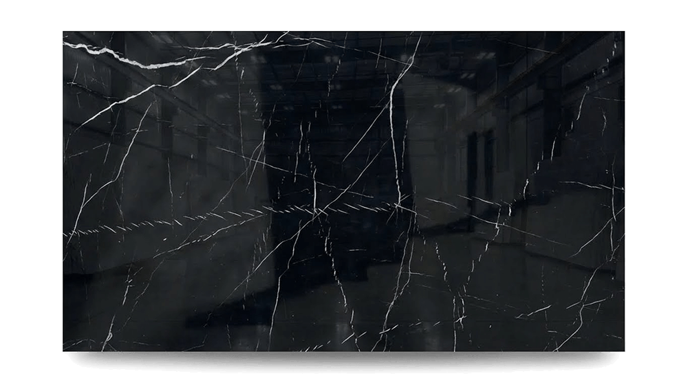 A classic black marble from Spain, famous for its deep velvet background and striking white lightning-like veins. This elegant stone brings sophisticated contrast to any space, making it a perfect choice for luxury floors, bathrooms, and feature walls.