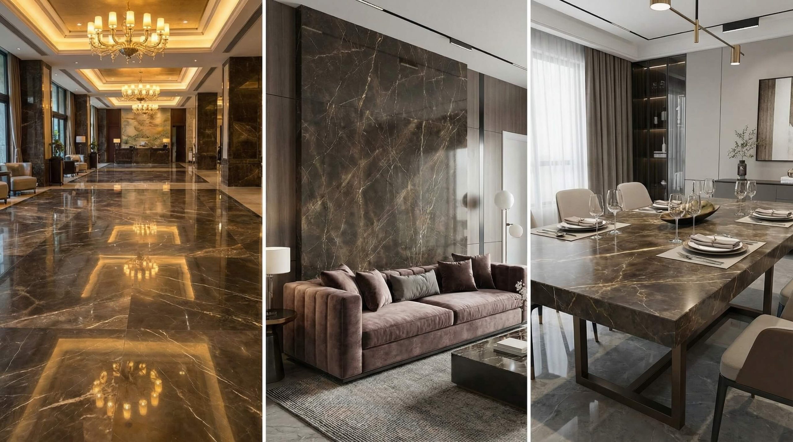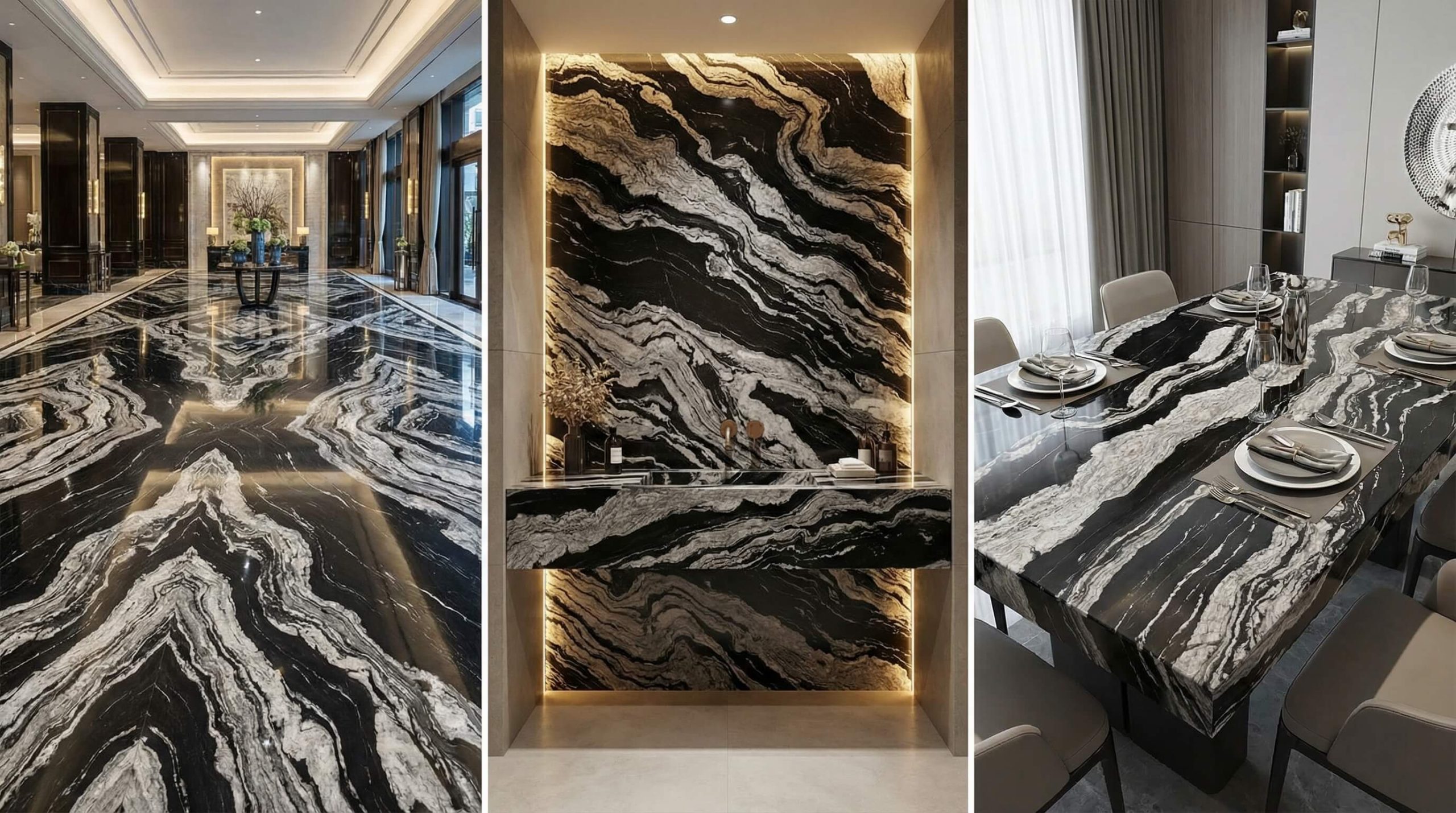 A prestigious renowned for its graphic, high-contrast black and white brecciated pattern. With a mosaic-like appearance, this exclusive stone creates a powerful visual impact, often favored for high-end retail interiors and modern.